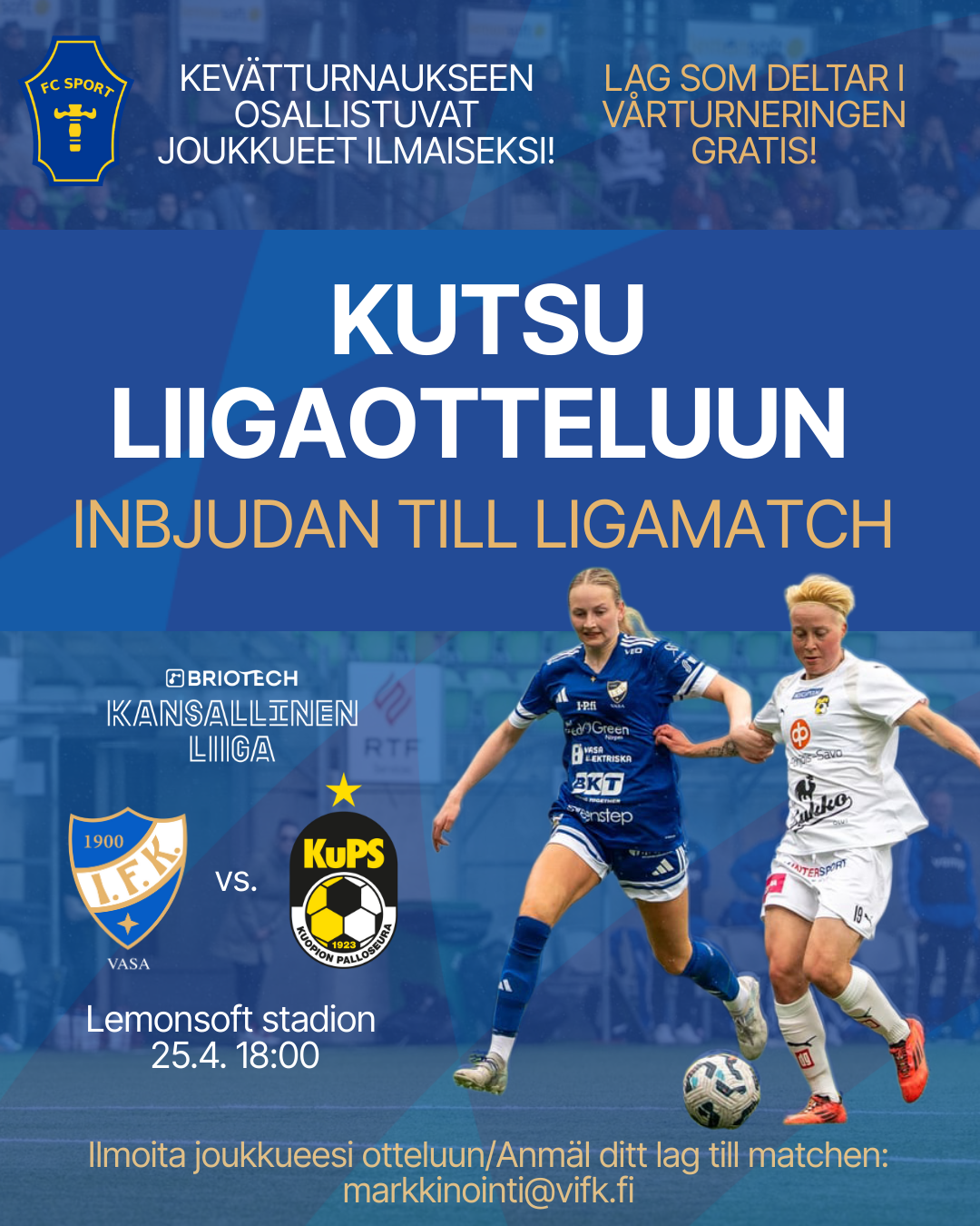 FC Sportin kevätturnaukseen osallistuvat juniorijoukkueet ovat lämpimästi tervetulleita ilmaiseksi seuraamaan naisten Briotech Kansallisen Liigan huippuottelua: