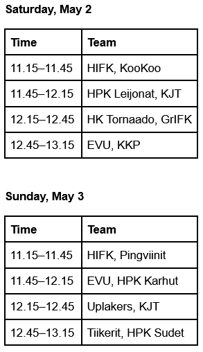 Lunch buffet for teams at Ravintola Olkkari according to the following schedule: