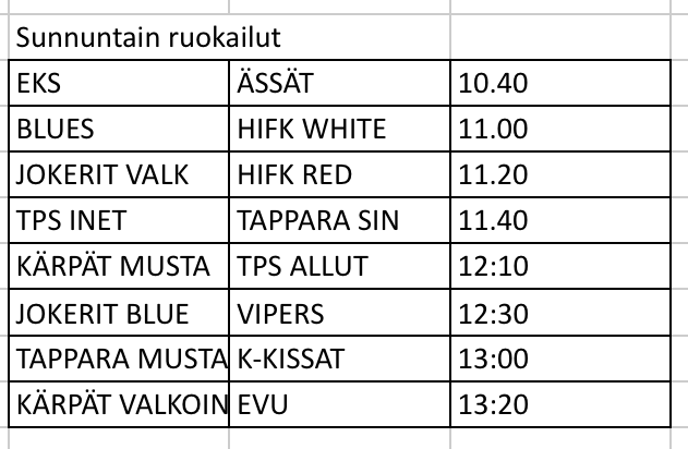 Sitovat tilaukset turnausruokailuun tulee tehdä juke.tuohino@gmail.com osoitteeseen 5.12.2025 mennessä. Ilmoita viestissä ruokailijoiden määrä per tarjoilu ja mahdolliset allergiat.