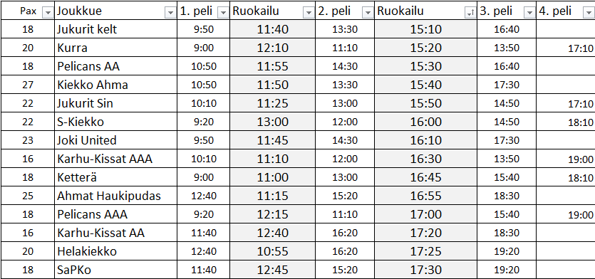 Alla vahvistetut lauantain 11.4. ruokailuaikataulut.