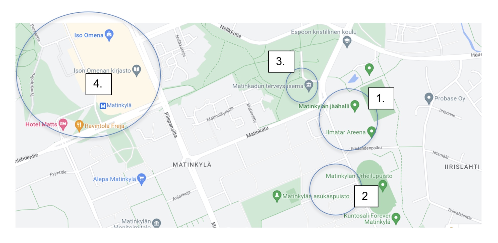 2. Matinkylän päiväkodin, asukaspuiston ja Matinkartanon tienvarren paikat (maksullisia, esim. EasyPark).