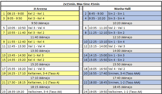Turnaus pelataan isolla kentällä 5 vs 5 + maalivahdit. Peliaika on 2 x 15 min tehokasta peliaikaa, kokonaisaika max. 45 min. Sijoitusotteluissa kokonaisaika ei ole käytössä.