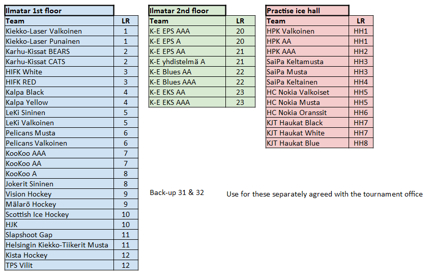 Pitkänmatkalaisille pyritään järjestämään kuivaustilat Ilmatar-areenalla. Kysele kuivaustiloja turnaustoimistosta, suositellaan ottamaan oma lukko mukaan!