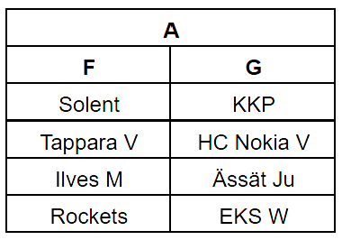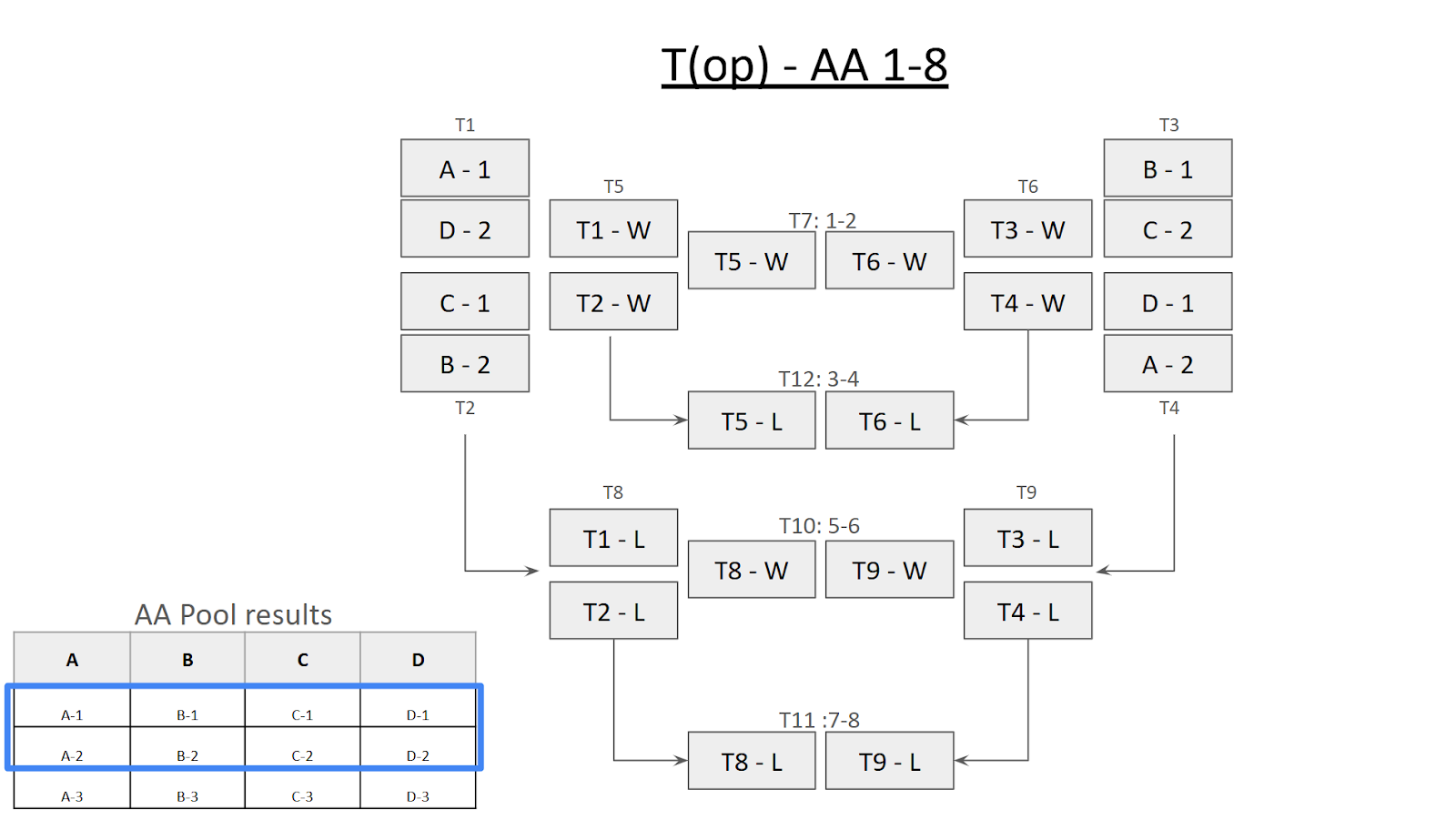 Pool standings (A-1, B-1…) for playoffs are based on points from pool games and pool out games.