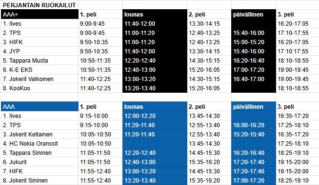 Ruokailujen ajankohdat on tehty peliohjelman mukaan.