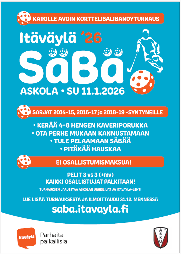 Turnauspäivän aikana Askola-Areenalla AskU:n vanhempien salibandyjuniorien kahvio ja onnenpyörä. Maksuvälineinä käyvät kortti ja käteinen.