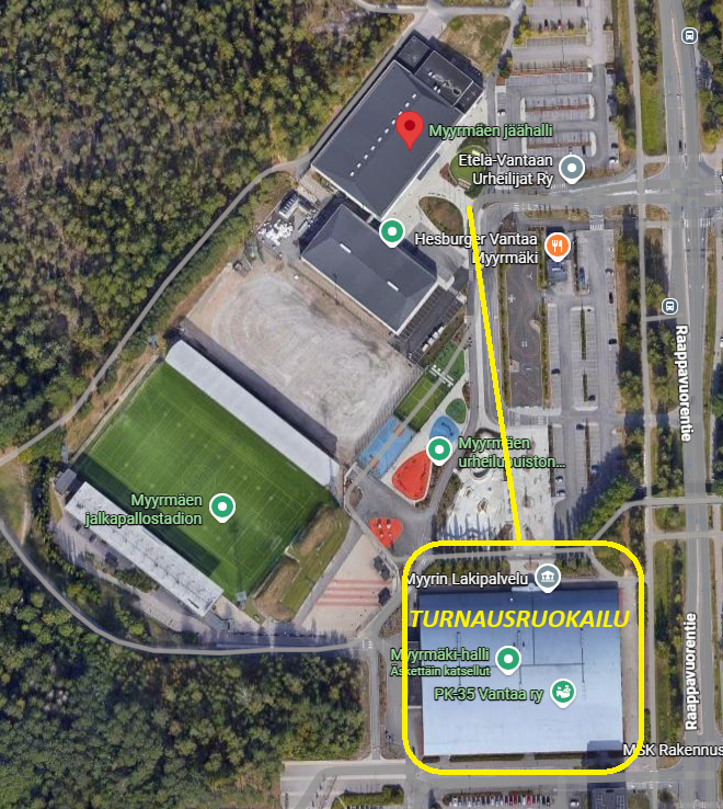 Turnauspäivänä on tarjolla sekä lounas että päivällinen hintaan 12,50 € per annos. Tarjolla on lämmin kotiruoka, salaatti/raaste, leipä, levite ja juomat. Toimihenkilöille ruokaan sisältyy kahvi ja pulla. Ruoka on laktoositonta. Allergiat ja erityisruokavaliot huomioidaan, kun ne ilmoitetaan tilauksen yhteydessä. Ruokailu tapahtuu Myyrmäkihallissa. Kts. kartta alla. Kävely jäähallilta noin 5 minuuttia. Pääovista sisään ja ruokailutila on vasemmalla.
