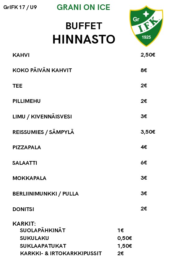 Buffet on avoinna pelien päättymiseen saakka, myynnissä kahvia, virvoitusjuomia, sämpylöitä, mokkapaloja, munkkeja yms