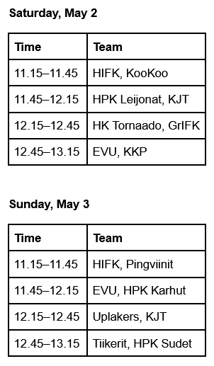 Lunch buffet for teams at Ravintola Olkkari according to the following schedule: