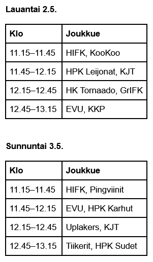 Turnausruokailu joukkueille jäähallin Ravintola Olkkarissa seuraavan aikataulun mukaisesti: