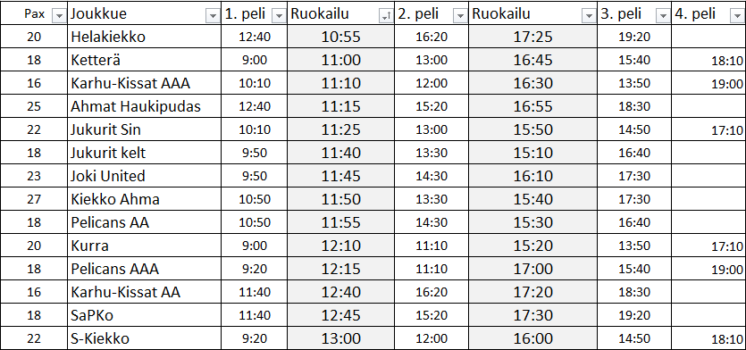 Alla vahvistetut lauantain 11.4. ruokailuaikataulut.