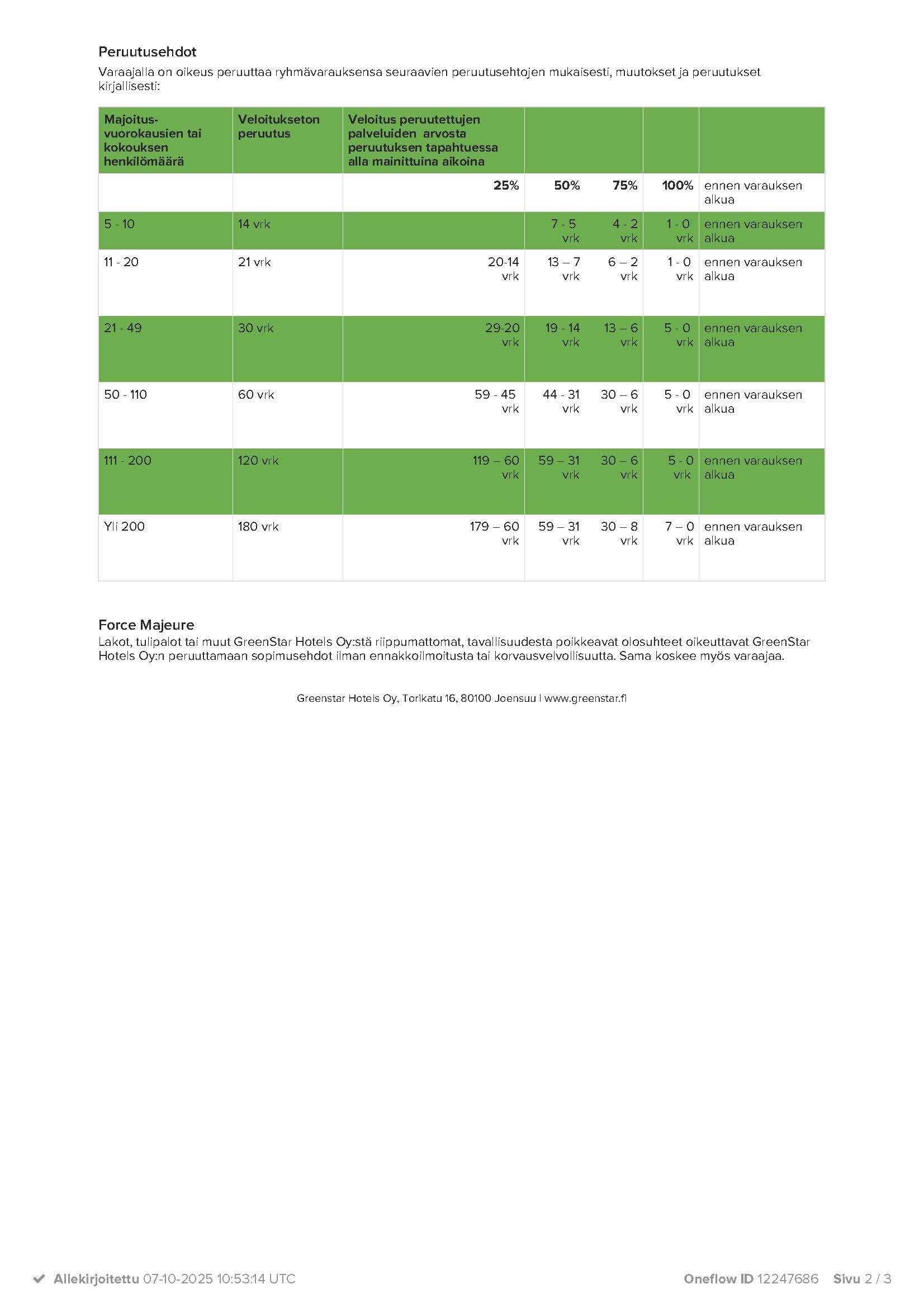 Force Majeure Lakot, tulipalot tai muut GreenStar Hotels Oy:stä riippumattomat, tavallisuudesta poikkeavat olosuhteet oikeuttavat GreenStar Hotels Oy:n peruuttamaan sopimusehdot ilman ennakkoilmoitusta tai korvausvelvollisuutta. Sama koskee myös varaajaa.