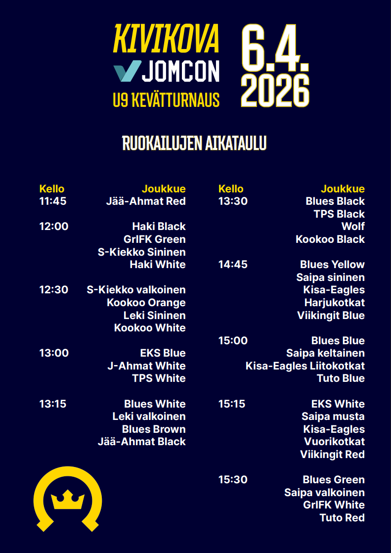 Ilmatar -areenan ravintolaan lounas ostettavissa etukäteen joukkueille (pelaajat+valmennus+huolto) 15.3.2026 mennessä.