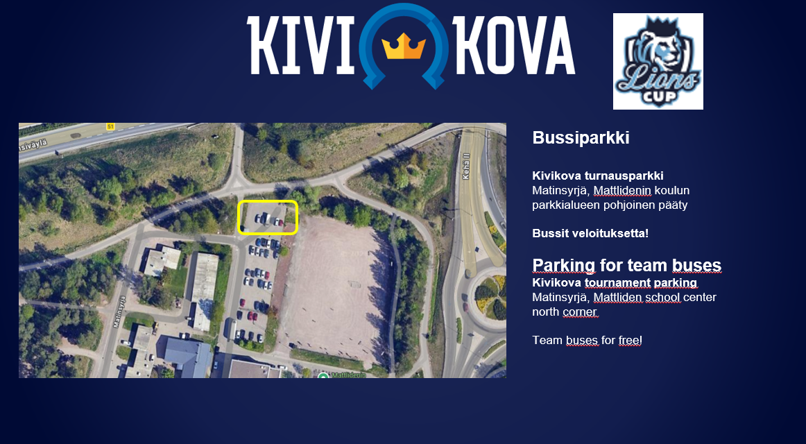 Buses can stop next to Arena to drop and catch the team, but long-term parking is allowed only at Kivikova tournament parking! (pls see below)