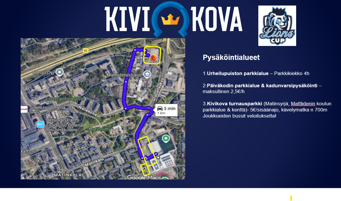 Joukkueiden bussit voivat jättää ja noutaa pelaajat jäähallin edestä - bussien pitkäaikainen pysäköinti on mahdollista veloituksetta Kivikova turnausparkissa! (kts alla)
