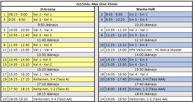 Turnaus pelataan isolla kentällä 5 vs 5 + maalivahdit. Peliaika on 2 x 15 min tehokasta peliaikaa, kokonaisaika max. 45 min. Sijoitusotteluissa kokonaisaika ei ole käytössä.