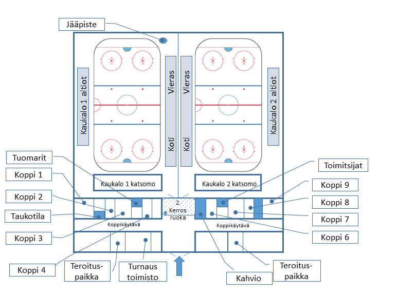Koppi 6 K-Laser Keltainen ja Valkoinen, Koppi 7 Kärpät Keltainen ja K-Oulu, Koppi 8 Hokki Red, Koppi 9 YJK ja MuJK,
