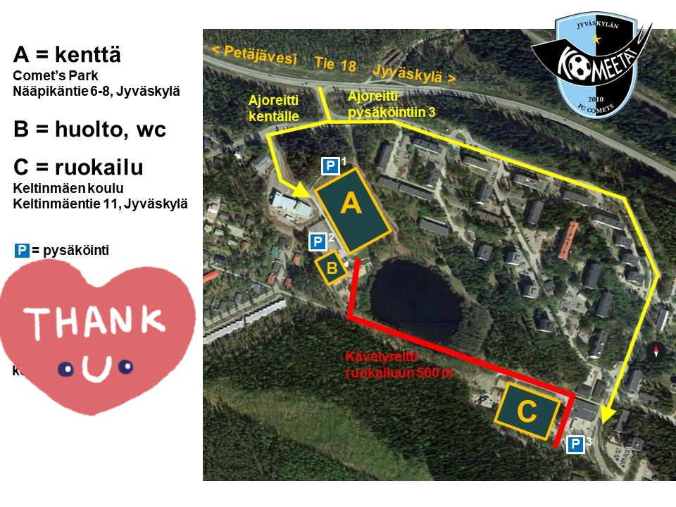 Parkkitilaa on kentän päädyssä heti Comets parkille tultaessa (P1). Siihen kannattaa myös jättää bussit. Henkilöautoille on paljon parkkitilaa Comets parkin rakennuksen edustalla (P2) sekä Comets parkin viereinen tenniskenttä on myös varattu pysäköintiin. Keltinmäen koulun vieressä on myös pysäköintitilaa (P3) mikäli haluaa ajaa ruokailuun autolla/bussilla. Ruokailuun pääsee helposti kävellen Kotalammen rantatietä pitkin, n. 500-700 m matka kävellen.