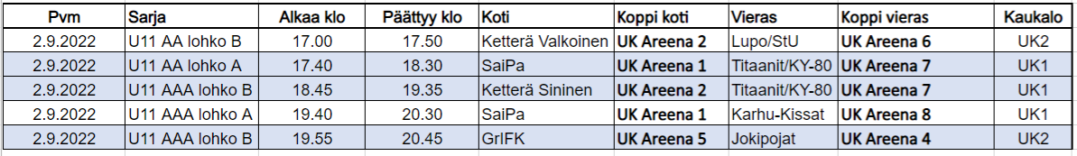 HUOM! Perjantain koppien osalta pelikohtaiset nimetyt kopit molemmissa ikäluokissa!