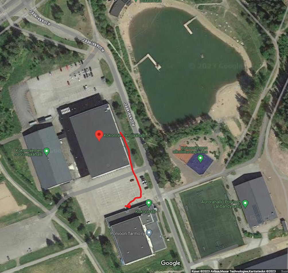 Lyhin matka on kulkea jäähallin pääoven kautta. Pääovi on Kisahallin jäähy/toimitsija-aition takana.